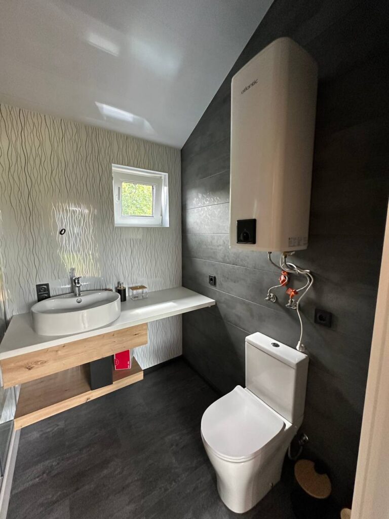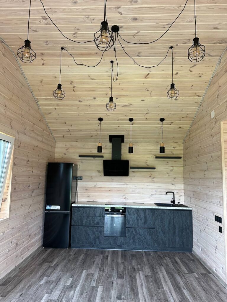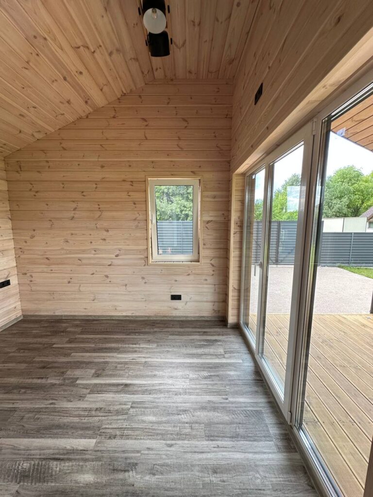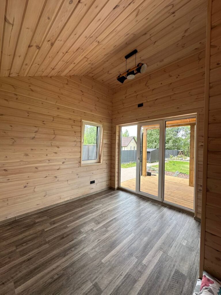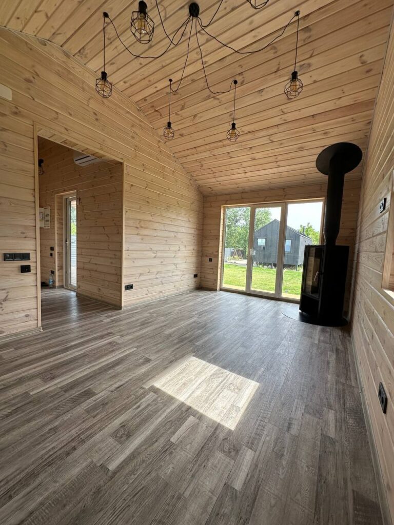 - Внутрішнє оздоблення – фальш-брус 20 мм + гіпсокартон, ламінат та плитка